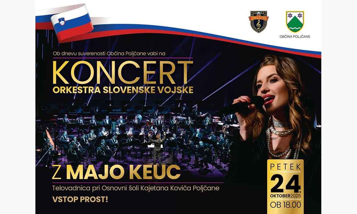 The Municipality of Poljčane invites you to a concert by the Slovenian Armed Forces Orchestra with Maja Keuc, which will take place on Friday, October 24, 2025, at 6:00 PM in the gym at Kajetan Kovič Elementary School in Poljčane.