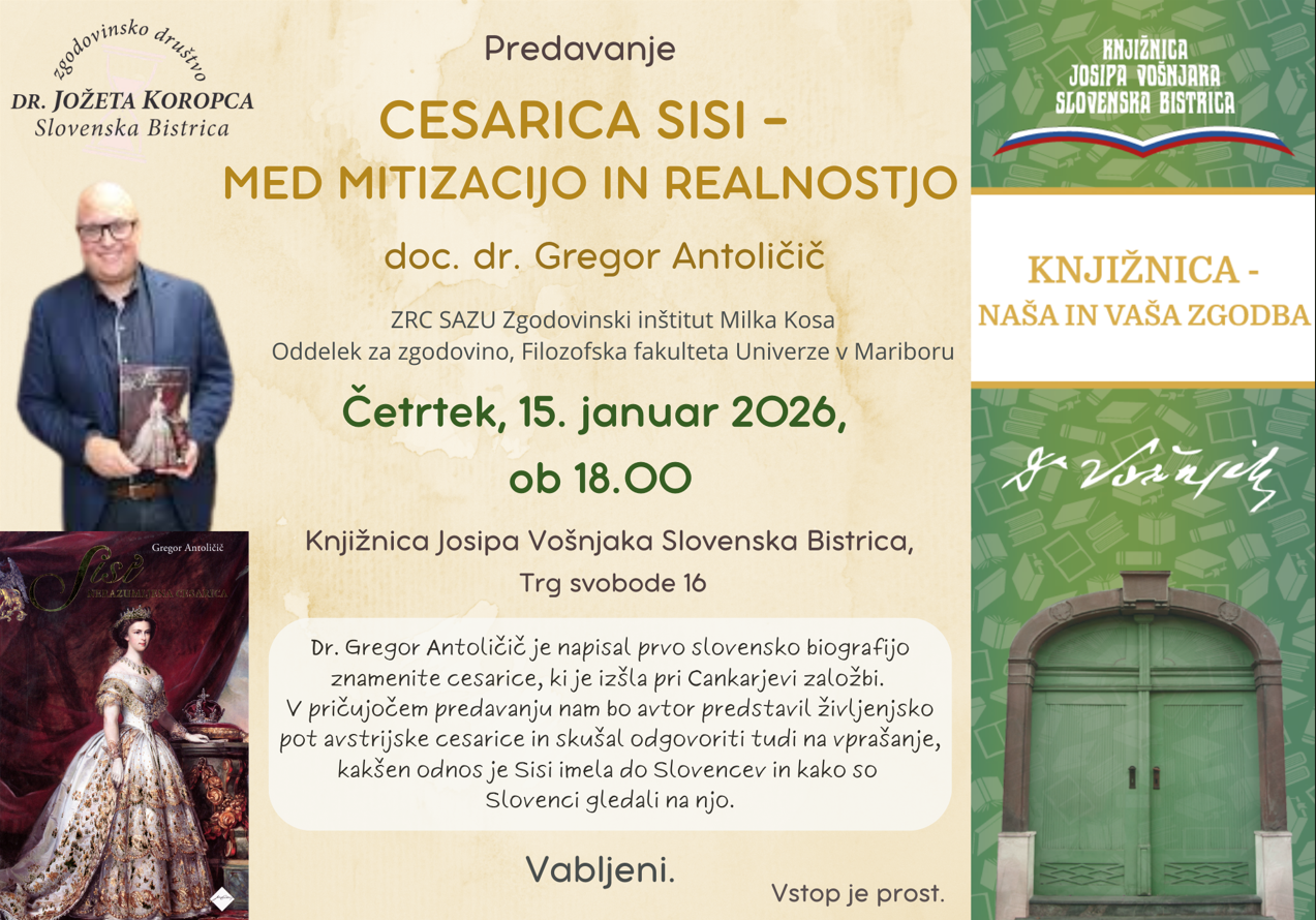 Knjižnica Josipa Vošnja SB vas vabi na predavenje Cesarica Sisi- med mitizacijo in realnostjo.