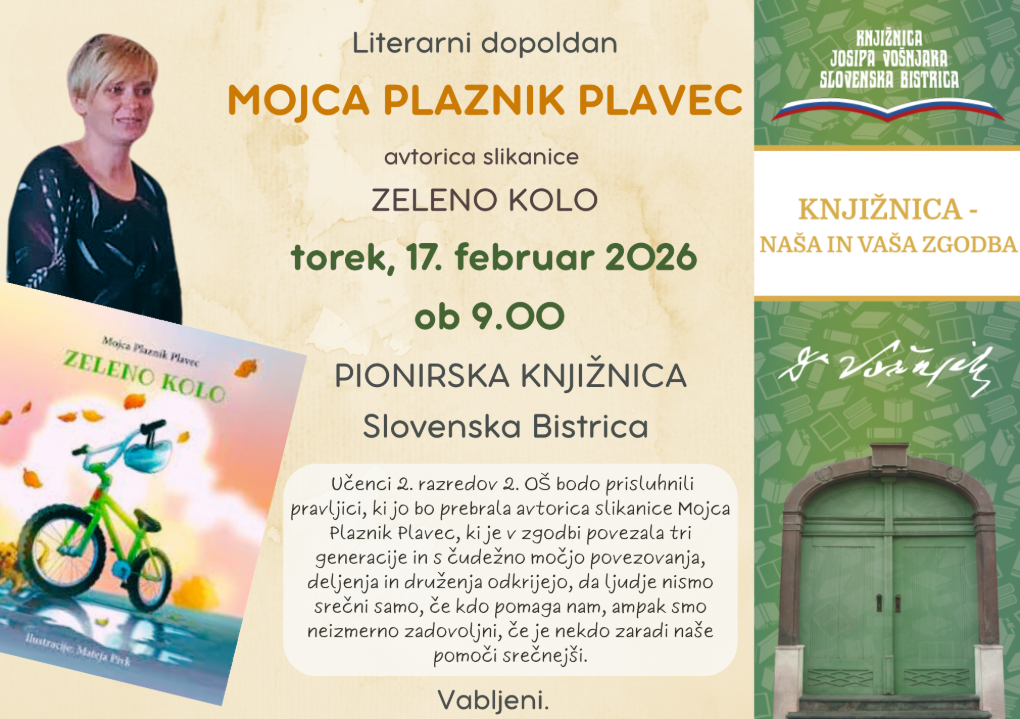 Knjižnica Josipa Vošnjaka Slovenska Bistrica vas vabi na literarni dopoldan Mojce Plaznik Plavec avtorice slikanice Zeleno kolo.